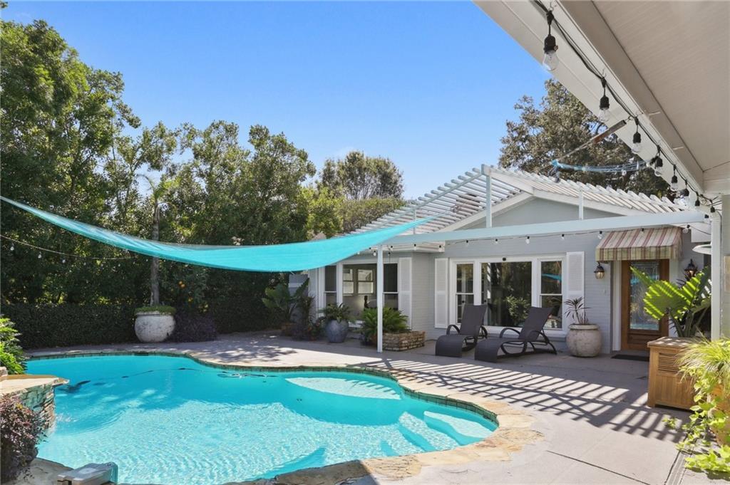 Set in the heart of Lake Vista, this home offers a private retreat surrounded by lush landscaping and resort-style outdoor living. Inside, warm hardwood floors and detailed crown molding highlight the open living and dining areas centered around a funcational brick fireplace. The updated kitchen features granite countertops, stainless steel appliances, a skylight and brick flooring that adds character. The serene primary suite opens directly to the patio, has great closet space and a nice en suite bathroom with a double sink vanity, large tub & glass shower. Step outside to a space designed for relaxation and entertaining complete with a sparkling in-ground saltwater pool and spa, and lush tropical landscaping. The expansive covered patio features ceiling fans, comfortable seating areas, private sauna and a bar with full size refrigerator and a bricked, wood burning fireplace. Additional highlights include a workshop and storage area, roof replaced within the last few years, subsurface drainage and synthetic turf on the lane-side yard space and updated ductwork completed in the past year. This home combines comfort, character, and relaxing amenities just minutes from City Park and lakefront on an nice sized lot on a quiet cul-de-sac street.